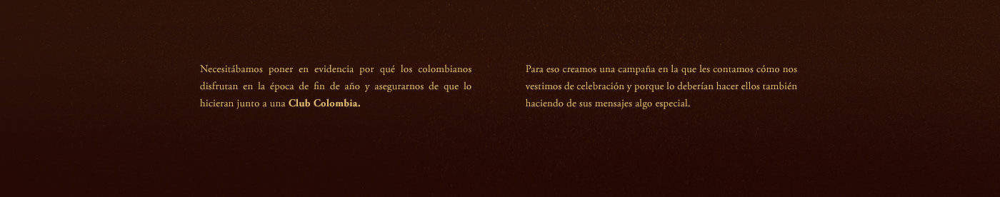 We needed to show why Colombians enjoy the end of the year with a Club Colombia. For that we created a campaign in which we told them how we dressed for celebration and why they should do it also making their messages something special.